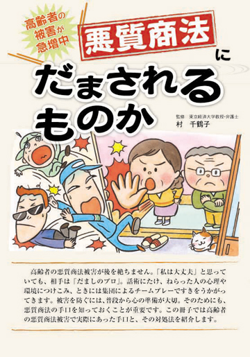 高齢者の被害が急増中 悪質商法にだまされるものか 監修:東京経済大学教授・弁護士 村 千鶴子 A4/ 表紙共8ページ/ カラー 88円(税抜価格80円) コンセプト 高齢者の被害が後を絶たない悪質商法の実例を、新しい手口を交えてわかりやすく紹介しています。高齢者の心につけこむ悪質業者の手口や、被害にあわないための対応策、成年後見制度やクーリングオフなども詳しく説明。高齢者の悪質商法被害防止の啓発に、最適の一冊です。 ツイート 名入れをする名入れとは? 名入れをご希望の場合、ご納品まで2~3週間程度お時間をいただきます。 名入れ 【名入れ料金表】 部数 基本料金(税込) 1部以上999部以下 5,500円 1000部以上 無料 ※別途御見積りになる場合があります。 【割引き料金表】 部数に応じて下記の割引価格が適応されます。 部数 金額(税込) 500部以上999部以下 85.80円 1000部以上1999部以下 84.70円 2000部以上2999部以下 83.60円 3000部以上3999部以下 82.50円 4000部以上4999部以下 81.40円 5000部以上6999部以下 80.30円 7000部以上9999部以下 79.20円 10000部以上19999部以下 77.00円 20000部以上 74.80円