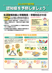 - 認知症予防のために、必要な情報をパネルにまとめました。認知症とはどのような病気かの説明と、認知症のサインを提示し、認知症の早期発見・早期対応につながるようにしています。また「認知症を予防する生活習慣」として現在エビデンスのある有酸素運動と食生活改善、脳の活性化の方法などをイラストとともに紹介しています。