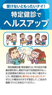 - 特定健診の受診率向上のために、郵送サイズの手軽さのなかに、特定健診の内容、健診受診のメリットなど、伝えるべき情報をきちんとまとめました。「受けないともったいナイ!」と感じる一冊です。特定保健指導対象者へのお知らせのパンフレットとデザインをそろえてセットで利用できます。