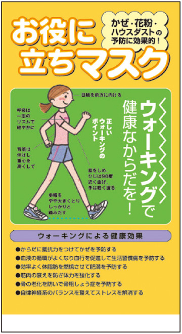 新型コロナウイルス感染症 グッズ お役に立ちマスク(1枚入り) ウォーキングで健康なからだを! 66円(税抜価格60円) コンセプト ノーズピースで確実にフィットし、低圧損性で息苦しさはありません。 ・サイズ:112mm×210mm ・マスク仕様:BFE98%以上 20,001個以上は別途お見積りいたしますのでお問い合わせください。 ※名入れをご希望の場合は、封筒への印刷となります。 ツイート 名入れをする名入れとは? 名入れをご希望の場合、ご納品まで2~3週間程度お時間をいただきます。 名入れ 【名入れ料金表】 部数 基本料金(税込) 1部以上5000部以下 33,000円 5001部以上 無料 ※別途御見積りになる場合があります。 【割引き料金表】 部数に応じて下記の割引価格が適応されます。 部数 金額(税込) 1部以上3000部以下 66.00円 3001部以上5000部以下 63.80円 5001部以上10000部以下 61.60円 10001部以上 59.40円