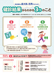 - 健診結果からわかることを、メタボリックシンドロームかどうか、どんな病気に気をつけたらいいか、どのように生活習慣を改善したらいいかの3つのポイントで紹介しています。健診結果一覧表から気になる病気を辿ることができ、生活習慣改善のしかたは食生活、身体活動、休養、喫煙の4つの項目でまとめています。