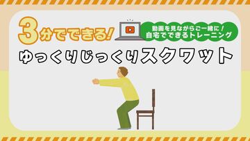- ゆっくりした動きで、高齢期にとくにおとろえやすい足腰の筋肉をきたえるスクワットをご紹介します。