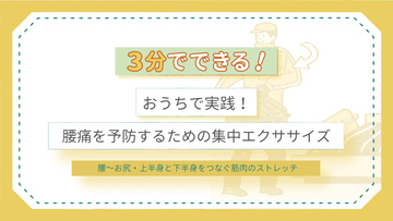 - おうちでできる腰痛を予防するための集中エクササイズ、腰~お尻・上半身と下半身をつなぐ筋肉のストレッチを紹介します。
