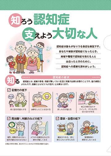 表面では、認知症の症状について解説。裏面では、本人と接するときに心がけたい点やおもな相談先を紹介するとともに、新しい認知症観についても触れています。