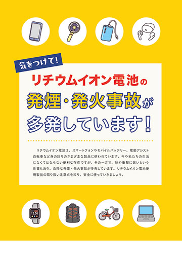 消費者問題 消費生活全般 新刊 リチウムイオン電池の発煙・発火事故が多発しています! A4/ 表紙共4ページ/ カラー 55円(税抜価格50円) コンセプト 今や私たちの生活になくてはならない存在となったリチウムイオン電池ですが、熱や衝撃に弱いことから、危険な発煙・発火事故が多発しています。安全に使うためにはどんなことに気をつけたらいいのか。事故事例を紹介しながら、そのポイントを簡潔にまとめました。 編集者からのひとこと リチウムイオン電池使用製品は生活の身近なところにあります。全ての年代の人に知っておいてほしい情報です。 ツイート 名入れをする名入れとは? 名入れをご希望の場合、ご納品まで2~3週間程度お時間をいただきます。 名入れ 【名入れ料金表】 部数 基本料金(税込) 1部以上999部以下 5,500円 1000部以上 無料 ※別途御見積りになる場合があります。 【割引き料金表】 部数に応じて下記の割引価格が適応されます。 部数 金額(税込) 500部以上999部以下 53.90円 1000部以上1999部以下 52.80円 2000部以上2999部以下 51.70円 3000部以上3999部以下 50.60円 4000部以上4999部以下 49.50円 5000部以上6999部以下 48.40円 7000部以上9999部以下 47.30円 10000部以上19999部以下 46.20円 20000部以上 44.00円