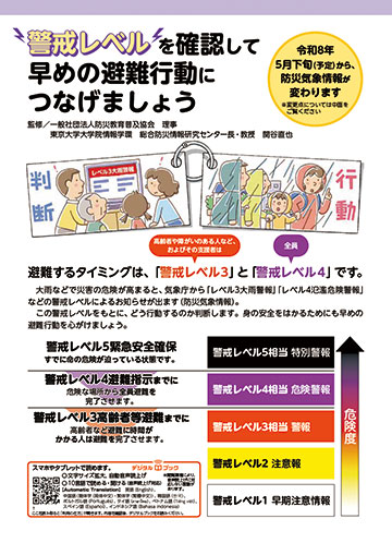 新刊 警戒レベルを確認して早めの避難行動につなげましょう 監修:一般社団法人防災教育普及協会 理事 東京大学大学院情報学環 総合防災情報研究センター センター長・教授 関谷直也 A4/ 表紙共4ページ/ カラー 55円(税抜価格50円) コンセプト 令和8年5月下旬に改正される防災気象情報について、改正内容をわかりやすくまとめたリーフレットです。「どの情報が出たら避難すべきか」に重点を置いて、中面に新しくなった防災気象情報を大きく掲載。目に付く場所に張ることにより、常に確認できる構成にしています。 活用できる事業 防災訓練、防災学習 ツイート 名入れをする名入れとは? 名入れをご希望の場合、ご納品まで2~3週間程度お時間をいただきます。 名入れ 【名入れ料金表】 部数 基本料金(税込) 1部以上999部以下 5,500円 1000部以上 無料 ※別途御見積りになる場合があります。 【割引き料金表】 部数に応じて下記の割引価格が適応されます。 部数 金額(税込) 500部以上999部以下 53.90円 1000部以上1999部以下 52.80円 2000部以上2999部以下 51.70円 3000部以上3999部以下 50.60円 4000部以上4999部以下 49.50円 5000部以上6999部以下 48.40円 7000部以上9999部以下 47.30円 10000部以上19999部以下 46.20円 20000部以上 44.00円